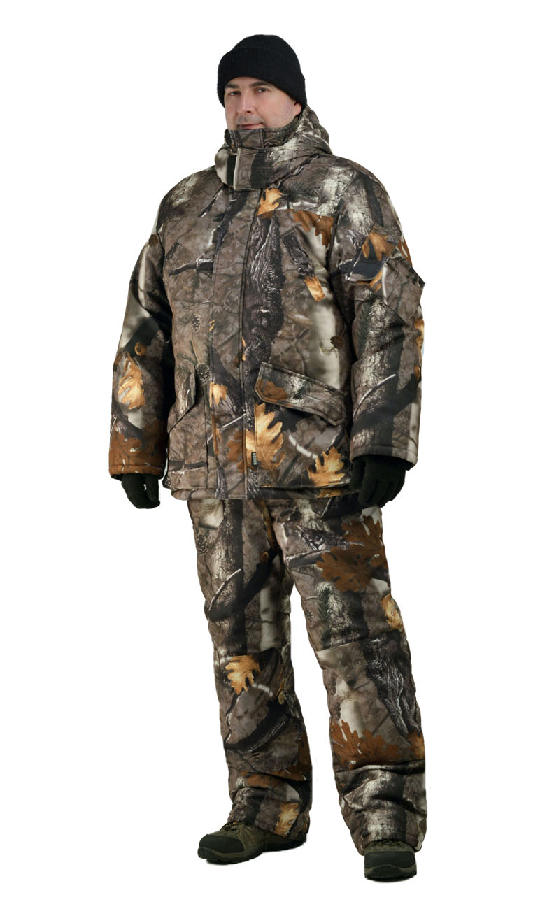 Камуфлированный универсальный костюм для охоты, рыбалки и активного отдыха при низких температурах. Не шуршит. Состоит из удлинненной куртки с капюшоном и полукомбинезона.