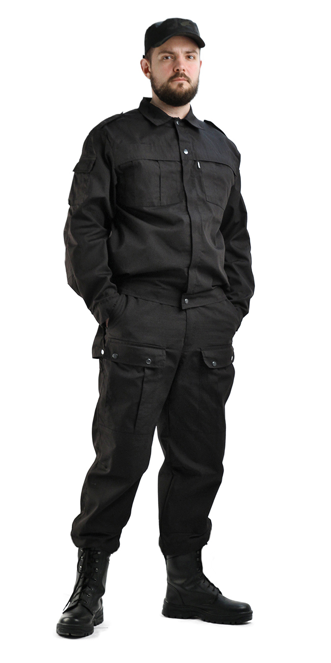 Брюки под широкий ремень, гульфик на молнию и кнопки, верхние боковые карманы, накладные объёмные карманы с клапаном на кнопки, усилительные накладки в области колен, на задней половинке фигурный накладной карман с фигурным клапаном, под клапаном патронташ, низ брюк под резинку, имеется пуфта со штрипкой.