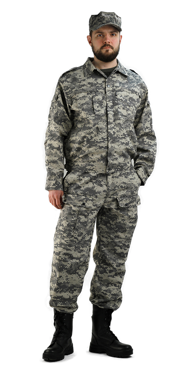 Куртка с застежкой на молнию, погонами. На рукаве накладной карман на молнии, внутренний карман для документов. Брюки с отстроченными стрелками и шлевками под широкий ремень.