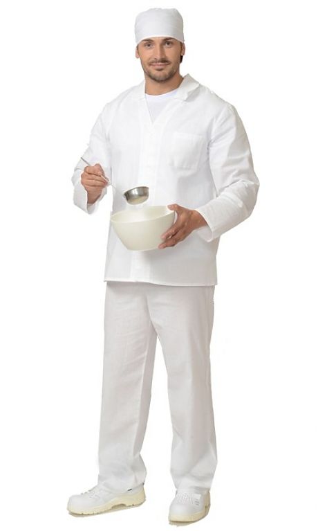 Тк. бязь, 100% х/б. Куртка с отложным воротником, застёжкой на пуговицы, нагрудным карманом. Брюки с резинкой в поясе. ГОСТ 9897-88.