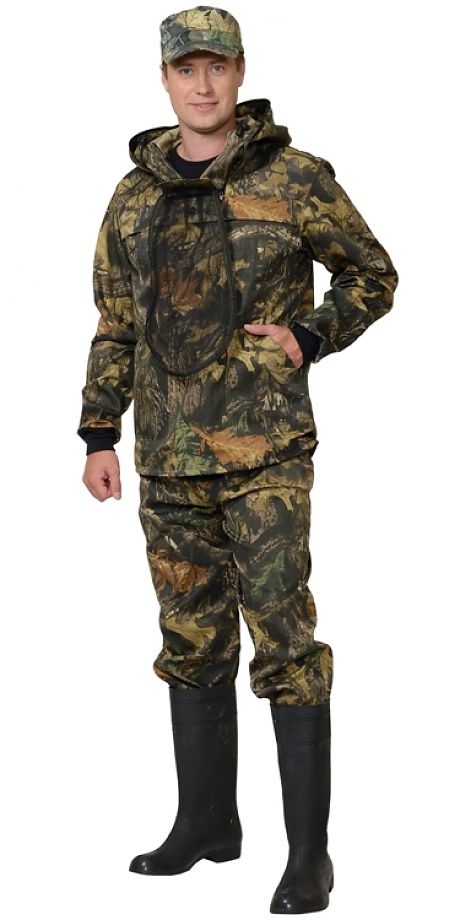 Тк. КМФ смесовая , 80% п/э, 20% х/б, пов. пл. 210 г/кв.м. Капюшон с сеткой, налокотн, наколен, низ куртки со шнуром. Трикотаж. манжеты рукавов, низа брюк. ТУ 17РСФСР 5109240-5584-90.
