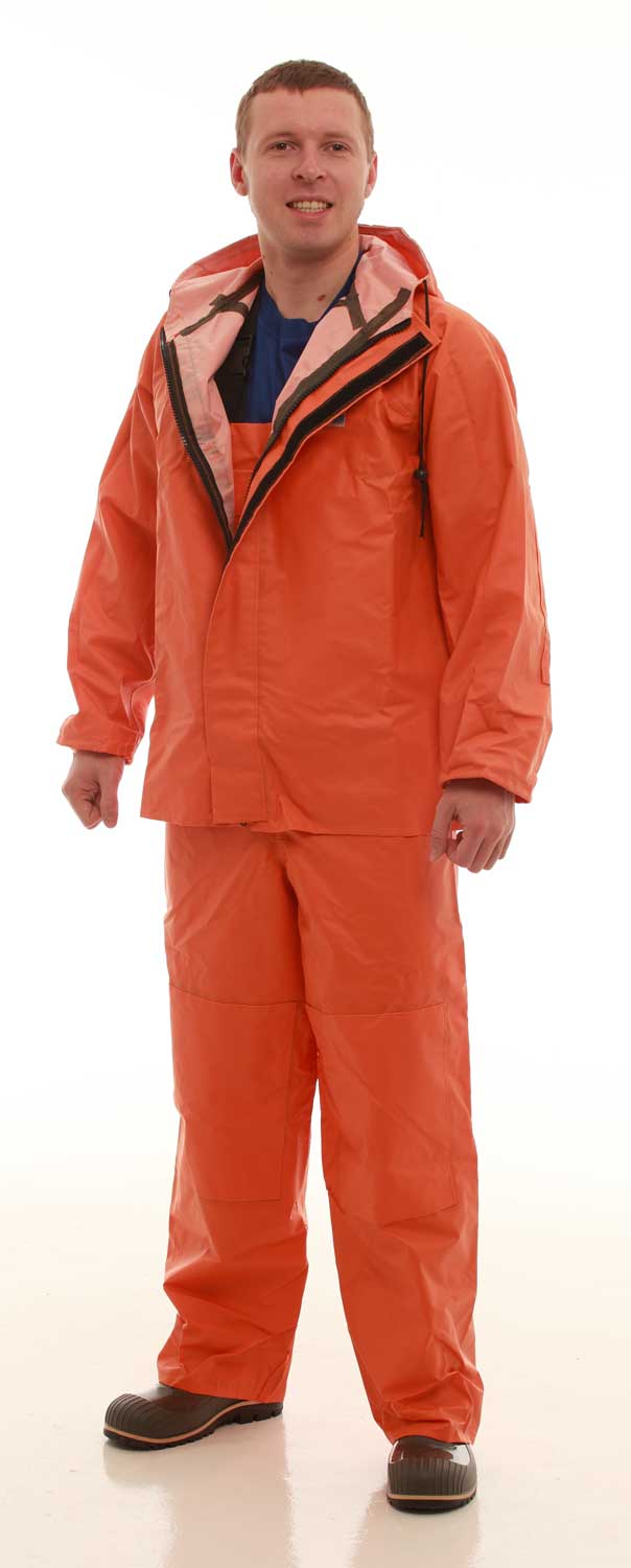 Выполнен из прорезиненной ткани, обеспечивает защиту от влаги, устойчив к морской воде и рыбьему жиру. Костюм состоит из куртки с капюшоном, с потайной застежкой, и п/комбинезона на бретелях.