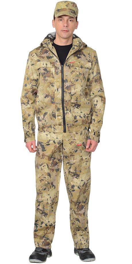 Куртка короткая прямого силуэта с втачным капюшоном с противомоскитной сеткой, с центральной застежкой на «молнию», с нагрудными карманами с клапанами на липучках, боковыми карманами в вертикальных швах, пояс куртки частично стянут резинкой, ширина рукавов регулируется хлястиками и липучкой.Полукомбинезон с центральной застёжкой на «молнию»; накладными карманами, с регулировкой по спинке и регулируемыми бретелями.Ткань: «CROWN-230» смесовая с ВО пропиткой: 80% п/э, 20 % х/б, пл. 230 г/м.ТУ 8550-01-81391241-2008