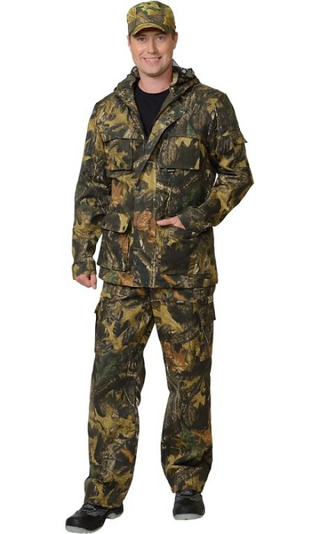 Тк. смесовая, ВО, 65% п/э., 35% х/б, 210 г/кв.м.Куртка c застёжкой-молнией и эластичной тесьмой по талии. Капюшон с антимоскитной сеткой. Рукава с манжетами на кнопках, на левом рукаве накладной объёмный карман. Низ куртки стягивается шнуром и фиксаторами. Брюки прямые с двумя накладными боковыми карманами и нижними объёмными карманами с клапанами по боковым швам, шлёвками для фиксации. ТУ 8550-001-81391241-2008.