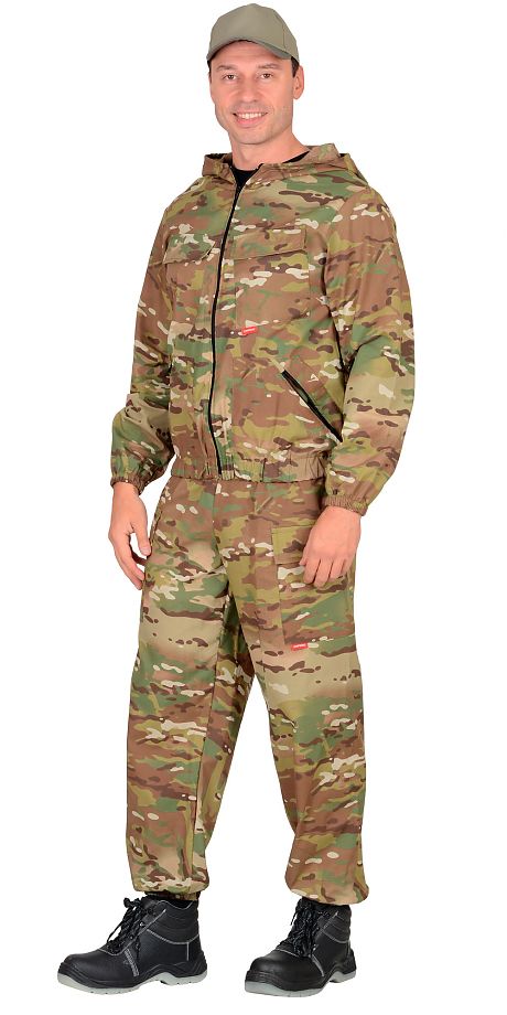 Костюм свободного покроя состоит из короткой куртки и брюк. Куртка с капюшоном со шнуром, застежка на тесьму-молнию, низ рукавов и пояс на резинке, два нагрудных кармана с клапаном, два объемных боковых накладных кармана на молнии. Пояс брюк эластичный, брюки имеют два накладных кармана