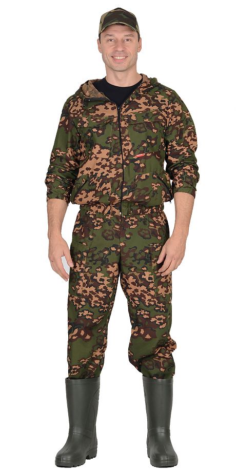 Костюм свободного покроя состоит из короткой куртки и брюк. Куртка с капюшоном со шнуром, застежка на тесьму-молнию, низ рукавов и пояс на резинке, два нагрудных кармана с клапаном, два объемных боковых накладных кармана на молнии. Пояс брюк эластичный, брюки имеют два накладных кармана