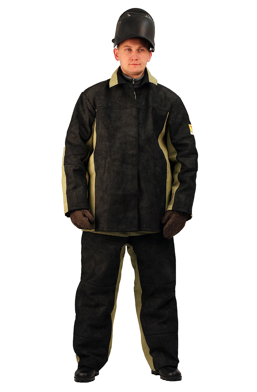 Костюм с накладками из кожевенного спилка, ОП, толщина спилка 1,1–1,3 мм. Куртка с супатной застежкой, карманами в боковых швах.
