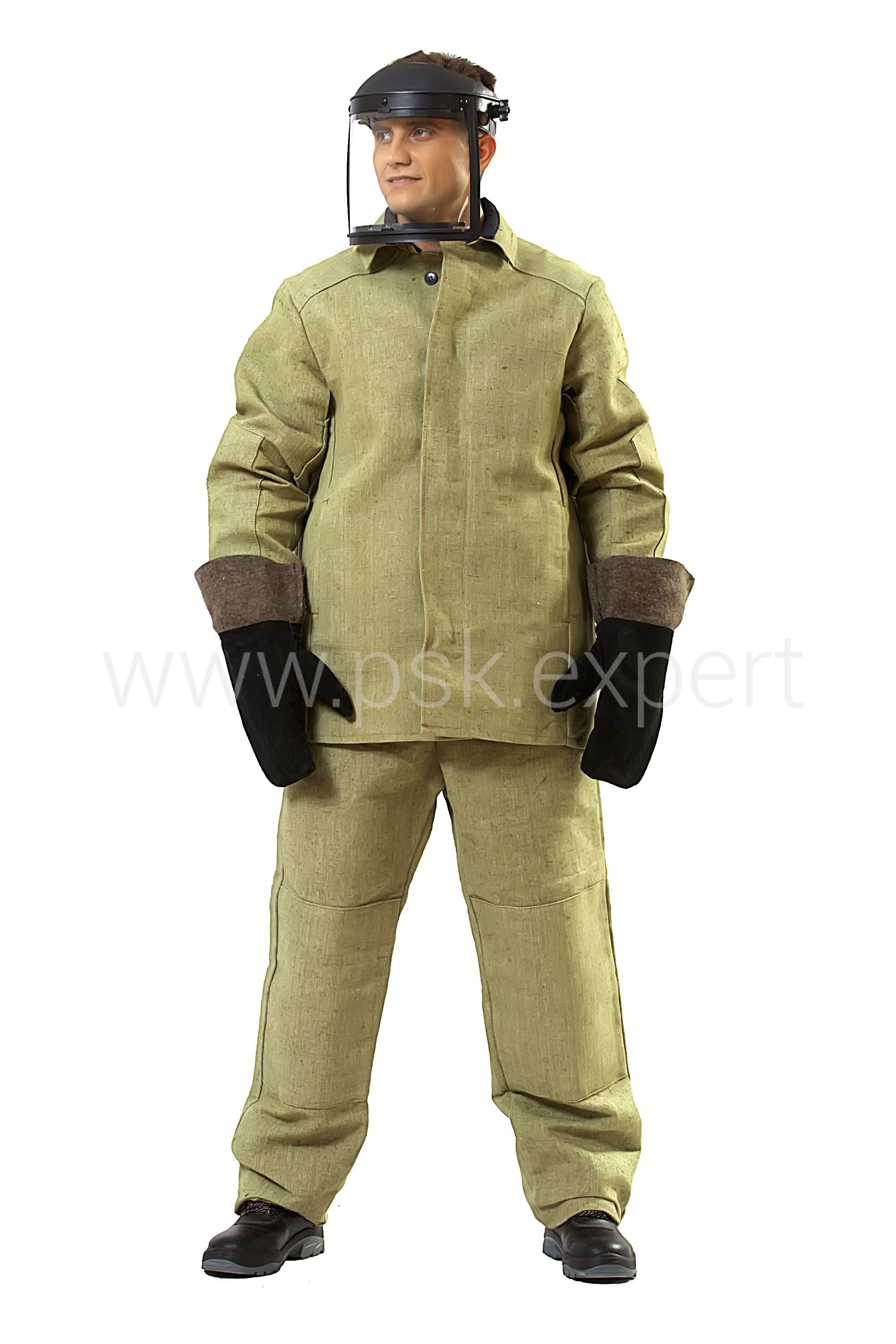 Костюм – куртка и брюки. Куртка с супатной застежкой на пуговицы. На спине кокетка с вентиляционными отверстиями. Внизу рукава пата для регулировки объема. Брюки свободного прямого покроя. Дополнительное усиление брезентовыми накладками в области локтей и колен.