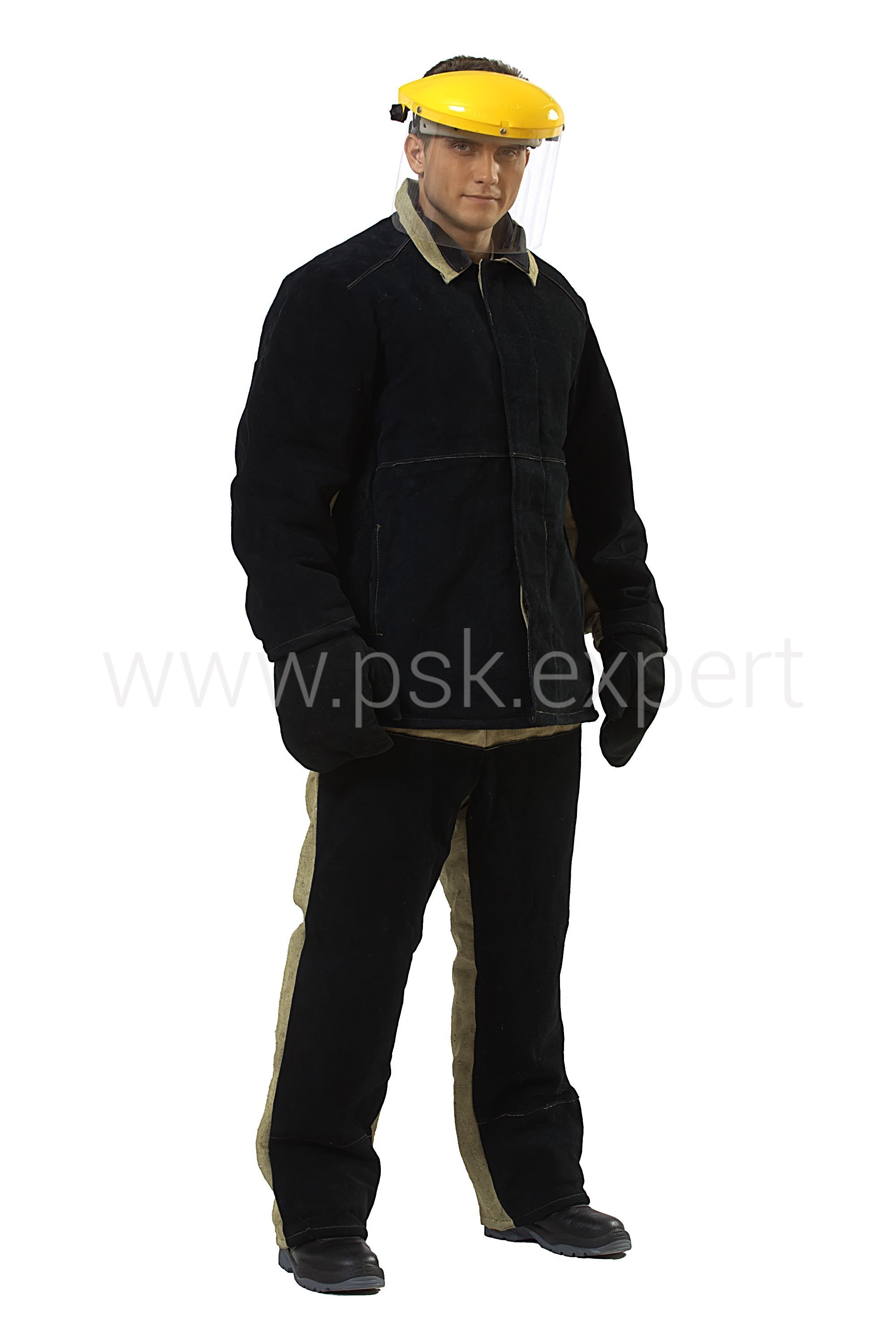 Костюм – куртка и брюки. Куртка с супатной застежкой на пуговицы, с карманами в боковых швах. В изделии используются накладки из спилка КРС общей площадью 230 дм2. Брюки свободного прямого покроя. Модель с притачным утеплителем из ватина.