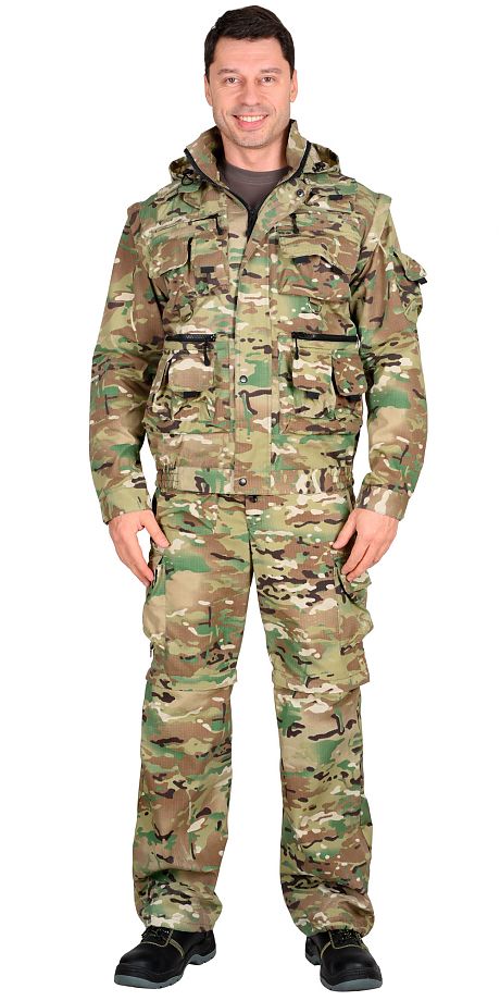 Костюм "Тигр" состоит из куртки и брюк. Куртка короткая, прямого силуэта, с центральной застёжкой на молнию накрытой ветрозащитным клапаном, застёгивающимся на 4-е кнопки, воротник стойка, пристёгивающимся капюшоном, различными многофункциональными карманами на "молнии", с клапанами на "липучках". Рукава пристёгиваются на "молнию", манжеты рукавов с патой регулирующие ширину при помощи "липучки". Низ куртки с притачным поясом стянутым, частично, резинкой. Брюки прямые с притачным поясом стянутым, частично, резинкой, застёгивающимся на 1 пуговицу, 5-ю шлёвками, застёжкой гульфика на тесьму "молния", с различными многофункциональными карманами. Низ брюк отстёгивается для трансформации брюк в шорты. Ткань верха костюм: "Рип - Стоп" с ВО, 65% п/э, 35 % х/б, поверхностная плотность 210 г/м2. Цвет: 102675 КМФ "Мультикам". Ткань подкладки: "Сетка", 100% п/э.