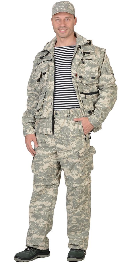 Тк."Рип-Стоп", ВО, 65% п/э., 35% х/б, 210 г/кв.м. Куртка удлинённая, прямого силуэта, с центральной застёжкой на молнию с ветрозащитным клапаном, пристёгивающимся капюшоном, различными многофункциональными карманами на «молнии», с клапанами на «липучках», складки на спинке для свободы движения. Рукава пристёгиваются на «молнию». Низ куртки с притачным поясом стянутым на резинке. Брюки с резинкой по талии, с различными многофункциональными карманами. Низ брюк отстёгивается и трансформируется в шорты. ГОСТ 12.4.280-2014