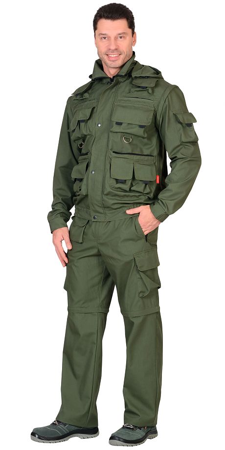 Тк."Рип-Стоп", ВО, 65% п/э., 35% х/б, 210 г/кв.м. Куртка удлинённая, прямого силуэта, с центральной застёжкой на молнию с ветрозащитным клапаном, пристёгивающимся капюшоном, различными многофункциональными карманами на «молнии», с клапанами на «липучках», складки на спинке для свободы движения. Рукава пристёгиваются на «молнию». Низ куртки с притачным поясом стянутым на резинке. Брюки с резинкой по талии, с различными многофункциональными карманами. Низ брюк отстёгивается и трансформируется в шорты. ГОСТ 12.4.280-2014