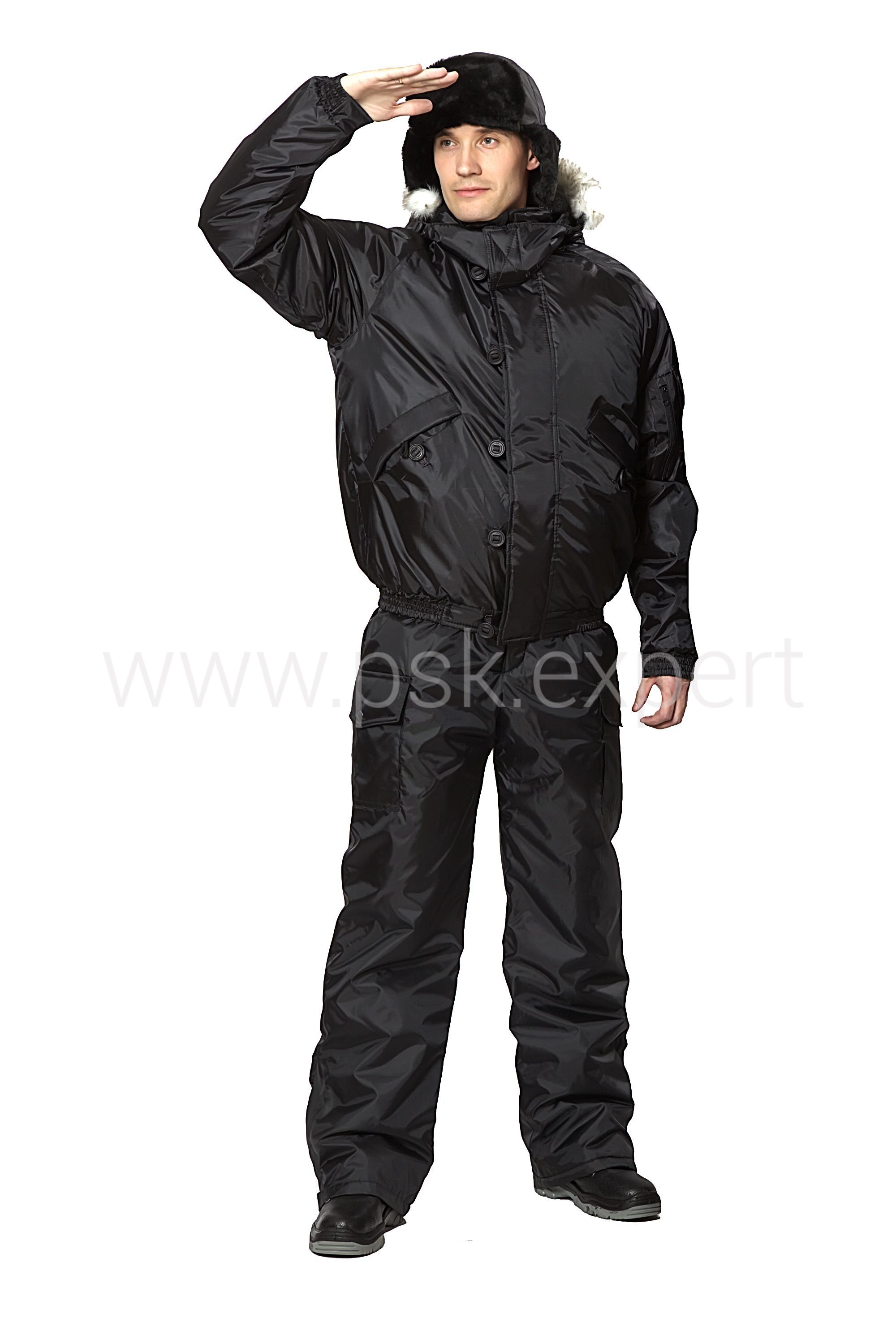 Костюм - куртка и полукомбинезон. Куртка с центральной застежкой на молнию, ветрозащитная планка - на пуговицы, воротник-стойка, отстегивающийся капюшон с регулировкой объема, два боковых кармана внизу и дополнительный карман на рукаве. Полукомбинезон с поясом на резинке, шлевками под ремень. Специальная конструкция низа полукомбинезона позволяет носить костюм с любой обувью.