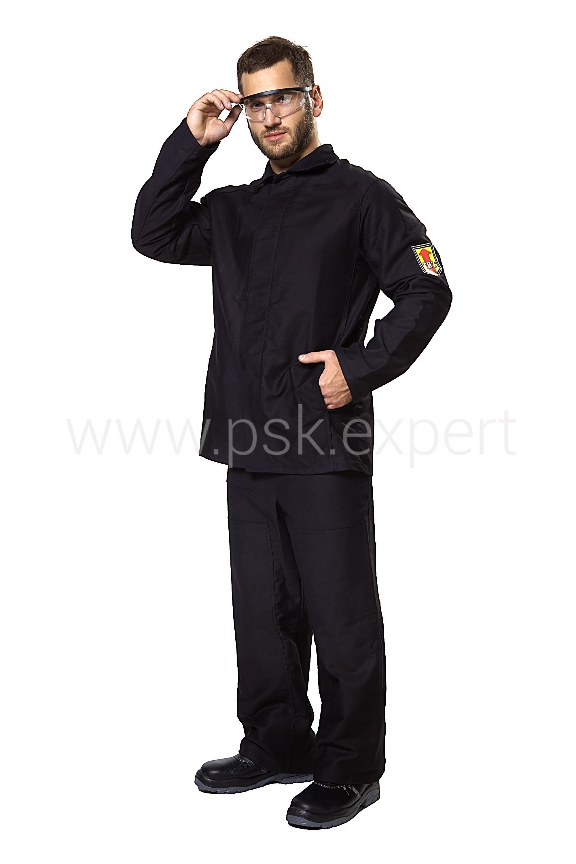 Костюм – куртка и брюки. Куртка с потайной застежкой на пуговицы и карманами в боковых швах. Брюки свободного прямого покроя с накладными карманами. На костюме усилительные накладки: на полочках куртки, рукавах, передних половинках брюк.