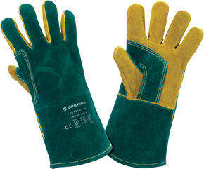 термостойкий спилок зеленого цвета, прошитый нитью Кевлар®, на ладонной части и большом пальце усиление, длина 35 см |
