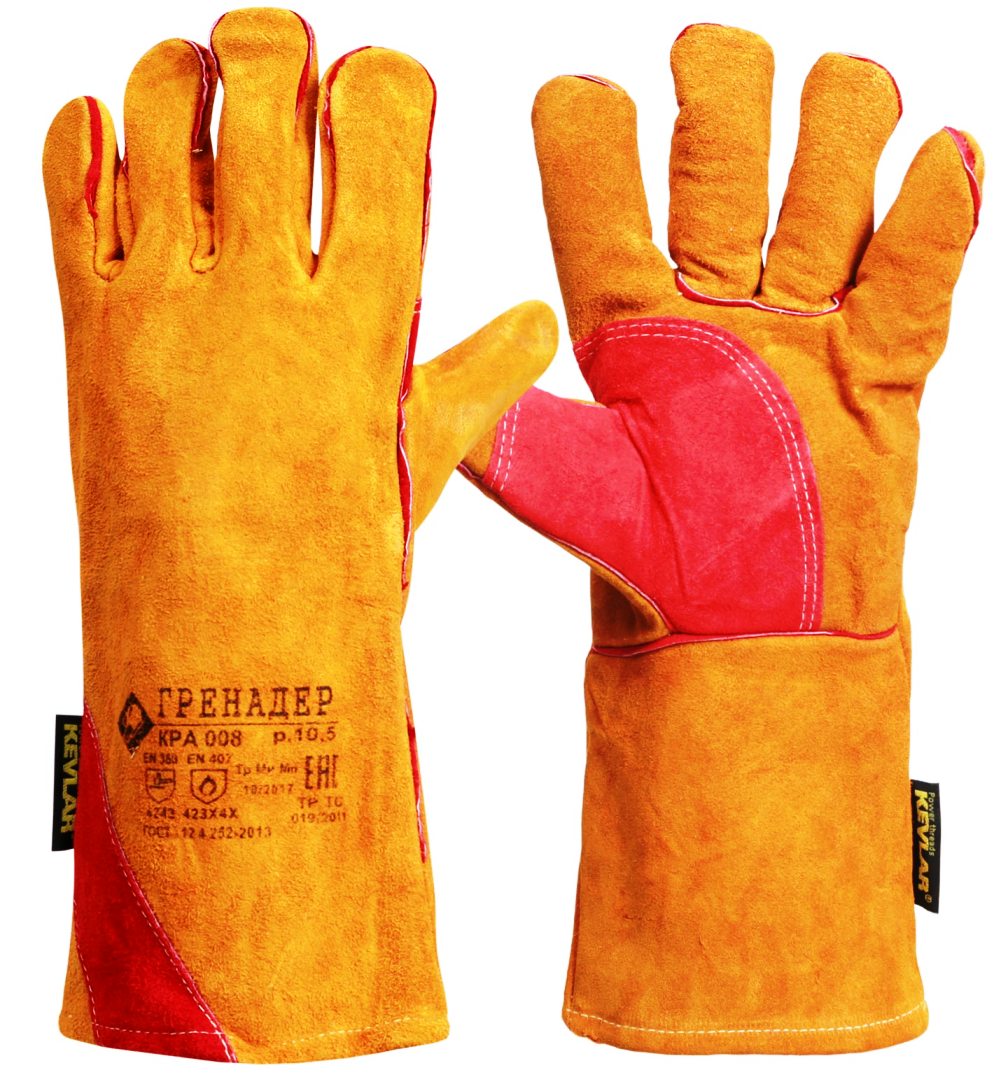Особо прочные краги. Пятипалые, изготовлены из кожевенного спилка; подкладка - хлопковая ткань, флис. Спилок КРС однородный, сорт А, 1,4+/-0,1 мм, шлифованный, золотистого цвета. Широкая манжета. Швы прошиты нитью Кевлар и усилены вставками из кожи. Ладонная часть и большой палец усилены накладками из спилка.