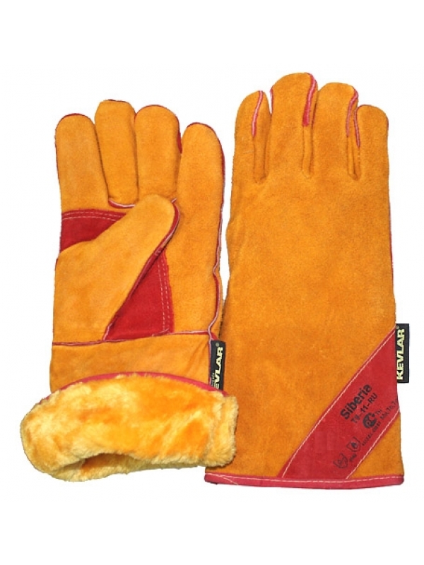 Изготовлены из спилка высшего качества класса А. Желтый цвет с красной отделкой. Утеплитель - искусственный мех. Обеспечивают защиту от тепловых воздействий, устойчивы к порезам и истиранию. Обеспечивают защиту от ожога при кратковременном контакте с раскаленной поверхностью, искр и брызг расплавленного металла. Изготавливаются из толстого спилка, швы прошиты прочной негорючей нитью Kevlar.