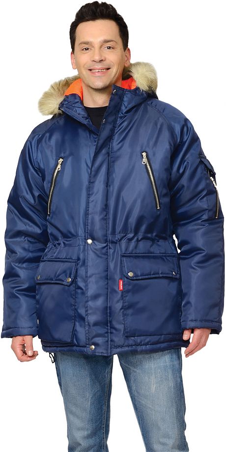 Тк. "Оксфорд", 100% п/э. Утеплитель: синтепон 360 г/кв.м. Подкладка: 100% п/э., оранжевая. Куртка длинная. Капюшон с опушкой из натурального меха. ГОСТ 12.4.236-2007.