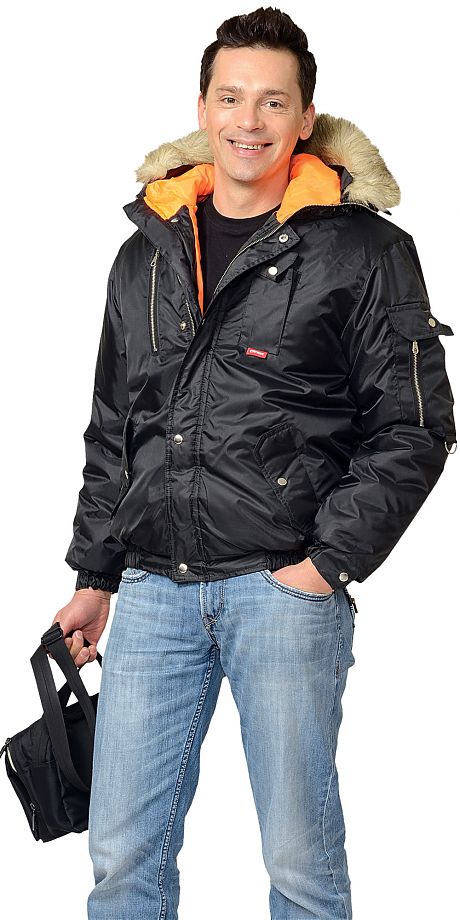 Тк. "Оксфорд", 100% п/э. Утеплитель: синтепон 360 г/кв.м. Подкладка: 100% п/э., оранжевая. Куртка укороченная. Капюшон с опушкой из натуральн. меха. ГОСТ 12.4.236-2007.