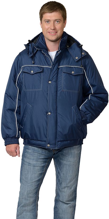 Ткань "Dewspo" 100% - п/э. Подкладка: 100% - п/э. Утеплитель: Синтепон - 240 гр. Куртка короткая, с притачной утеплённой подкладкой, с центральной застёжкой на "молнию" и внешним ветрозащитным клапаном, с воротником стойка, с пристёгивающимся утеплённым капюшоном, с верхними накладными и нижними прорезными карманами с "листочкой". Рукава с внутренними трикотажными манжетами.