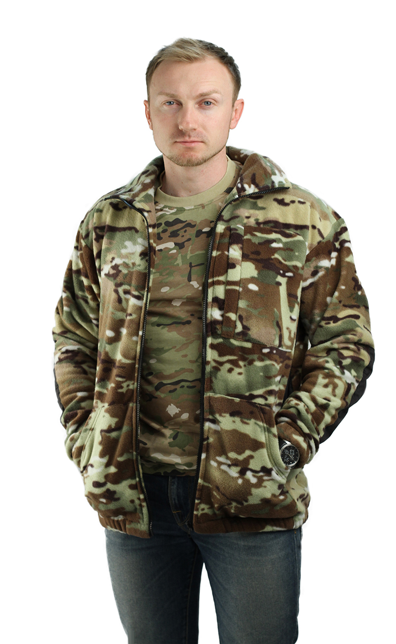 Универсальная куртка из флиса. Обеспечивает высокоэффективную теплозащиту и максимальный комфорт, позволяя коже дышать. Куртка прямого силуэта с центальной застежкой на "молнию", с декоративными вставками из отделочной ткани "Дюспо" в боковых частях. Воротник-стойка, два боковых и один нагрудный карман. На рукавах из отделочной ткани "Дюспо" настрочены налокотники.