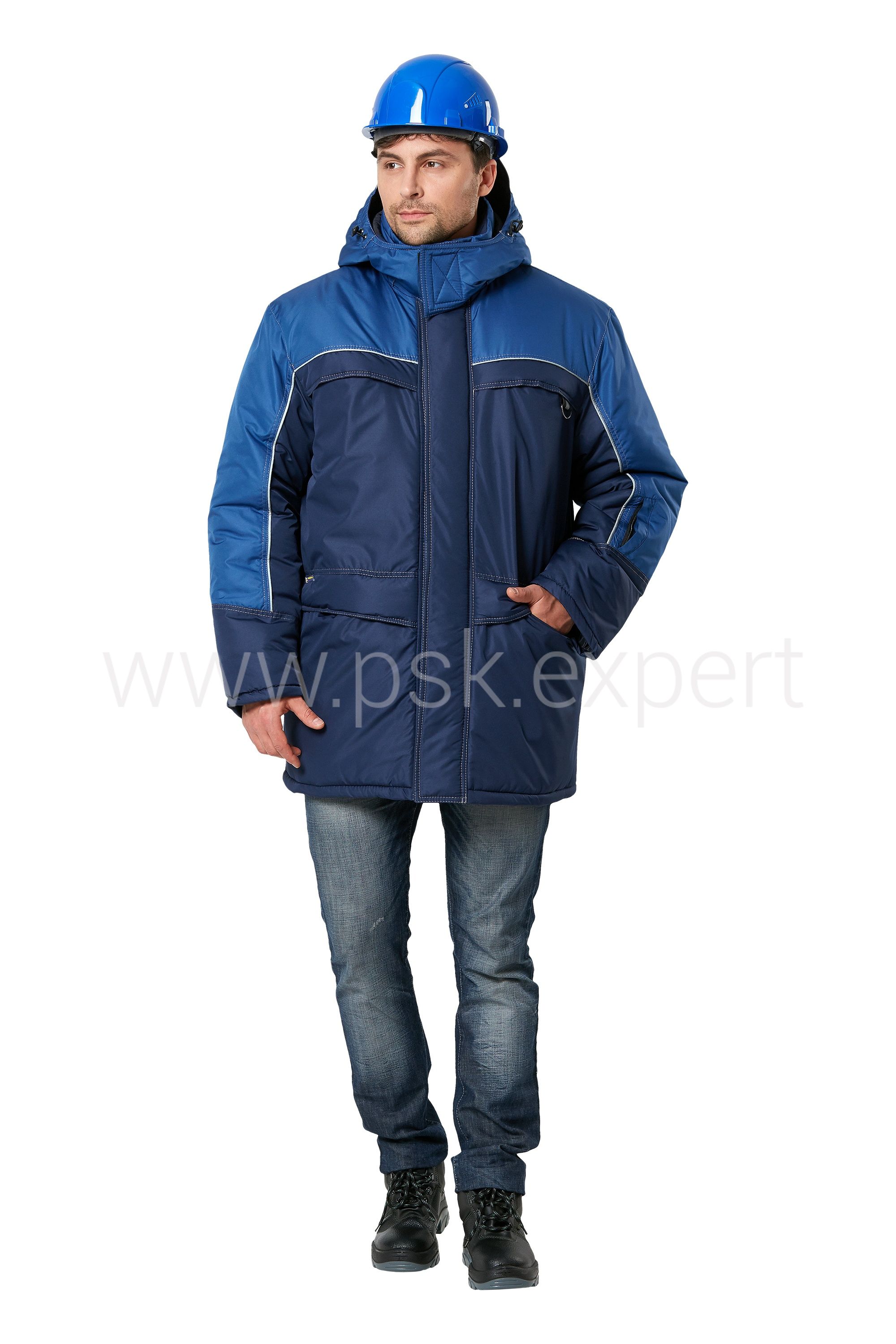Куртка удлиненная с центральной застежкой на двухзамковую молнию и ветрозащитную планку с контактной лентой. Пристегивающийся на молнию капюшон с регулируемым объемом, позволяющим одевать его на каску. Воротник- стойка. Два нагрудных, закрытых планками, и два нижних кармана. Один внутренний карман с настроченной лентой для указания ФИО владельца.