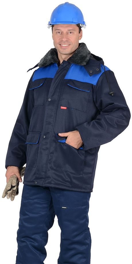 Тк. смесовая ВО, 80% п/э, 20% х/б., пов. пл. 210 г/кв.м. Тёмно-синяя с васильковой отделкой. Утеплитель: синтепон 360 г/кв.м. Подкладка: 100% п/э. ГОСТ 12.4.236-2007.