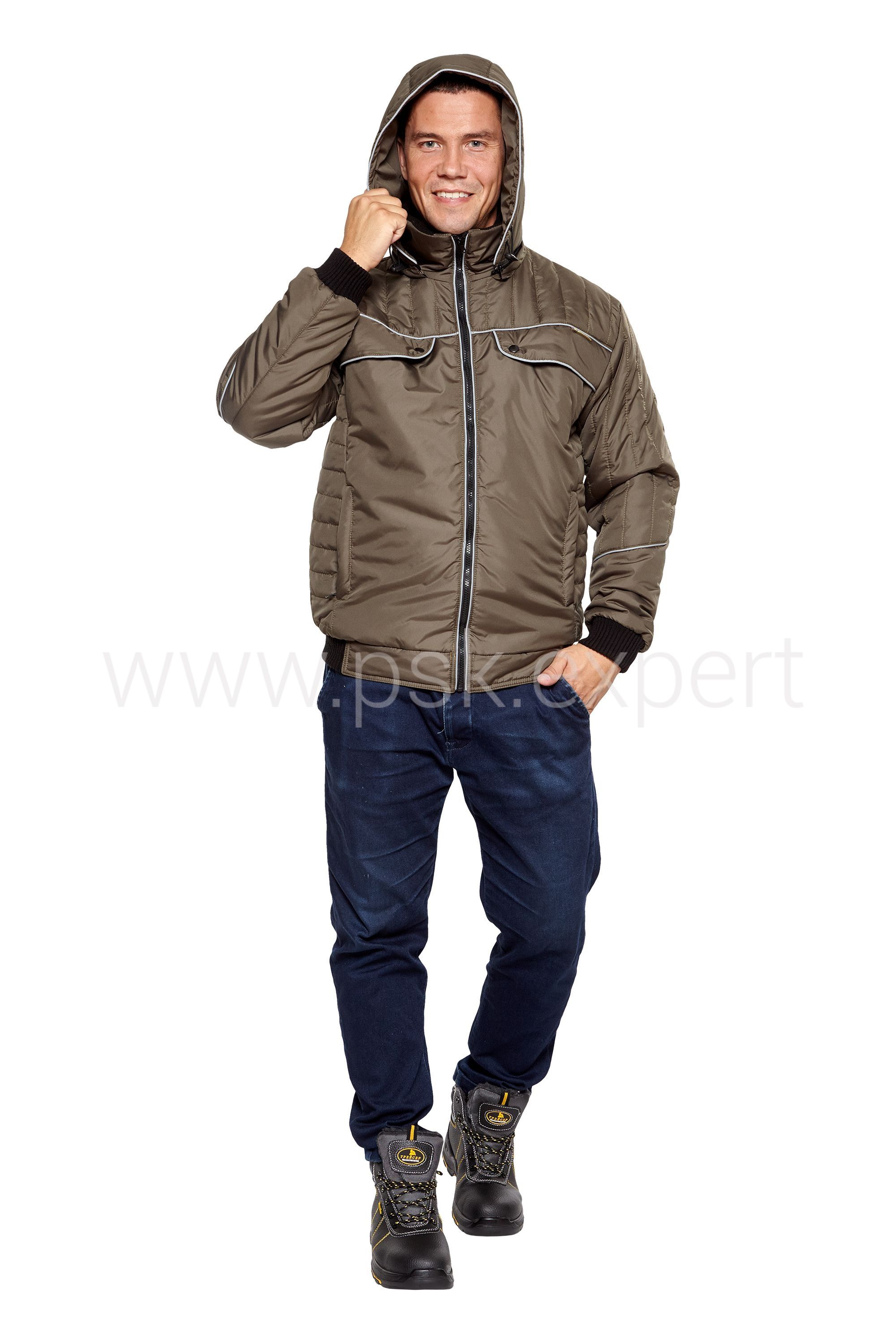 Два нагрудных кармана с клапанами, застегивающимися на кнопки. Нижние карманы застегиваются на молнию. Один внутренний накладной карман, застегивающийся на контактную ленту. Кокетки полочек и спинки, верхняя часть рукавов и боковая часть полочек простежены параллельными строчками. По лицевой части капюшона, контуру клапанов карманов, по швам притачивания кокеток полочек и спинки, деталей рукавов, расположен светоотражающий кант.