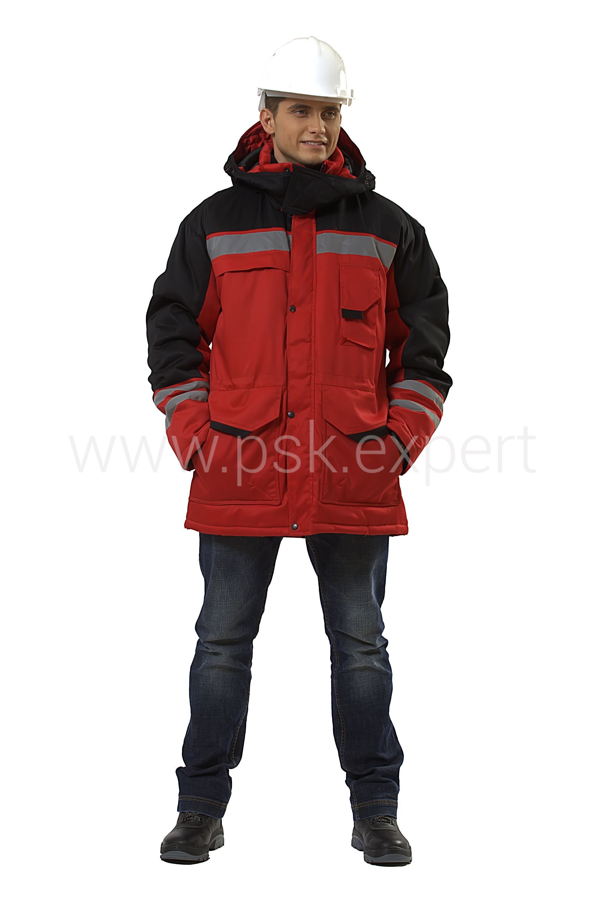 Куртка с центральной застёжкой на молнию и кнопки, с пристегивающимся капюшоном, с трикотажными напульсниками по низу рукава. Кокетка полочек, спинки, боковые части капюшона и средние части рукавов выполнены из отделочной ткани контрастного цвета. Внутренний воротник и карманы для дополнительного комфорта утеплены флисом. На куртке объемные накладные карманы, удобный карман с клапаном на груди для средств связи. Куртка с лентой СОП на груди, спине, по низу рукава.