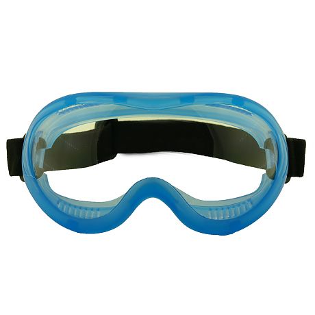 Очки с непрямой вентиляцией, увеличенным панорамным обзором, с защитным бесцветным стеклом из поликарбоната (РС) с твердым покрытием. Обеспечивает защиту от высокоскоростных частиц, капель жидкостей и оптического излучения. Корпус изготовлен из голубого ПВХ. Регулируемая наголовная лента.