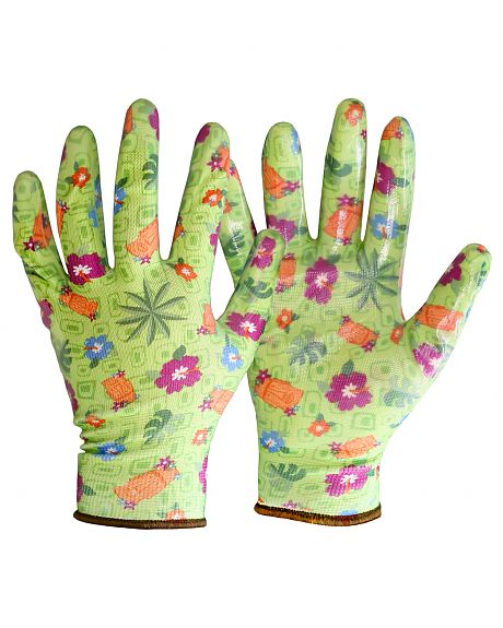 Перчатки САДОВЫЕ зеленые (100%нейлон 13-го кл. вязки,с принтом,покрытие-прозр.нитрил),в уп120пар