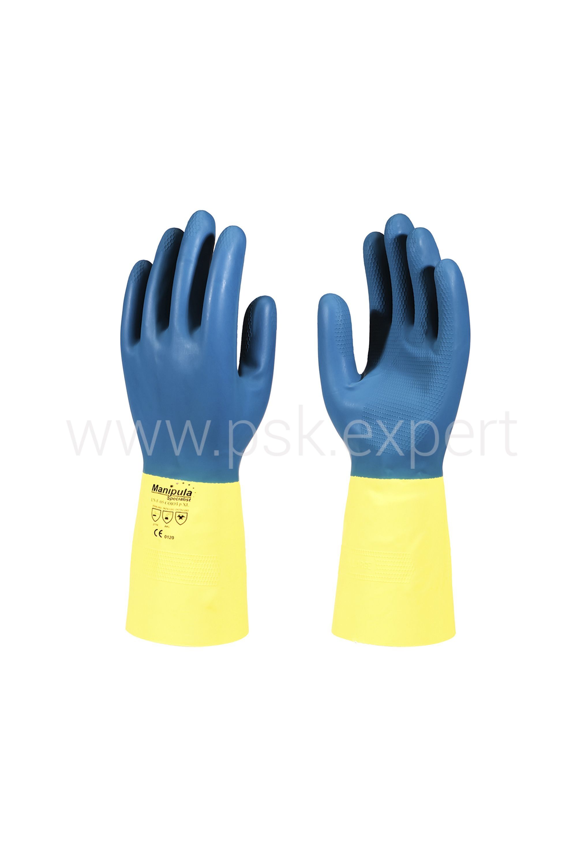 Перчатки из латекса, имеют внутренний ХБ ворсовый слой. Отсутсвие швов не позволяет проникать различным жидкостям и химикатам на кожу рук, обеспечивая безопасность при использовании. Неопреновая рабочая поверхность многократно увеличивает химическую (КкЩ50) и механическую защиту. Рабочая поверхность соты для лучшего сцепления с предметами, а так же предотвращает скольжение предметов в руке. Анатомическая форма для снижения усталости рук. Рекомендованы для нефтегазодобывающей и химической промышленности, лакокрасочного производства, агропромышленного комплекса, для работы с тяжелыми хим.реактивами, для общетехнических работ.