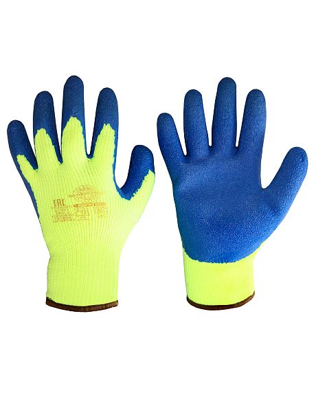 Перчатки из акрила 7-го класса вязки. Ворсовая подложка. Оверлок. Латексное покрытие ладони и пальцев. Губчатая поверхность. Подходят для механических работ припониженной температуре.