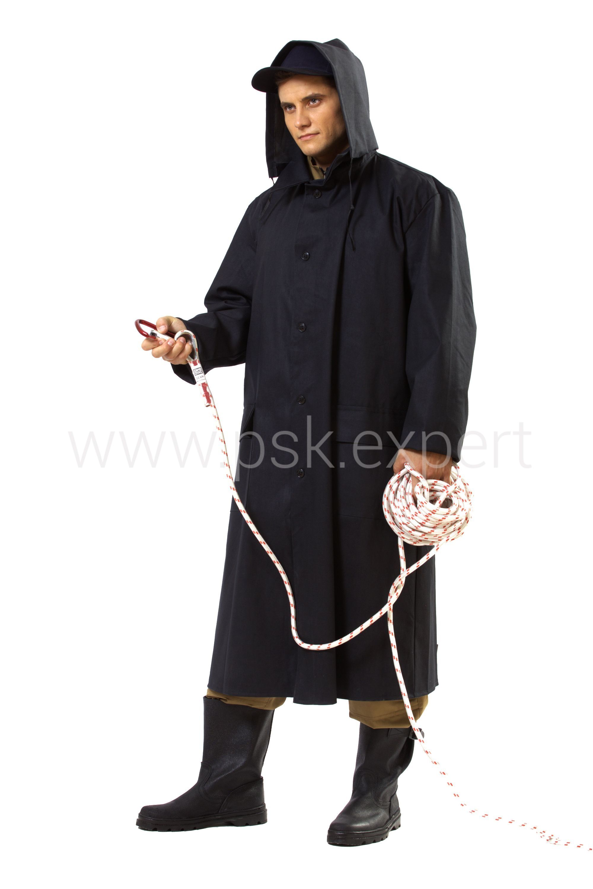 Плащ прямого силуэта с центральной застежкой на пуговицы, отложным воротником, отстегивающимся и регулируемым по объему капюшоном, двумя накладными карманами. Швы не проклееены.