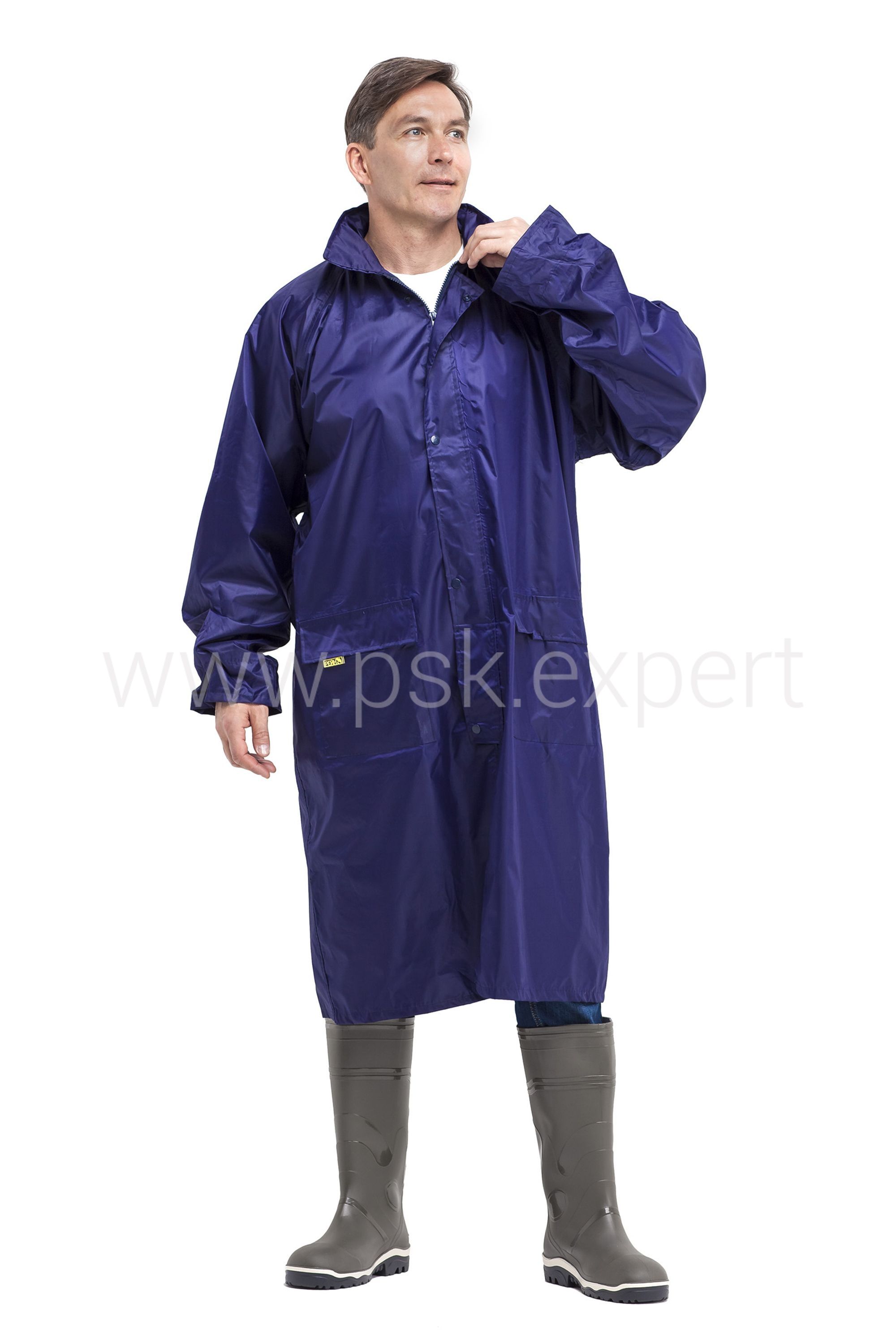 Плащ с центральной застежкой на молнию и ветрозащитной планкой на кнопках, с капюшоном, с двумя накладными карманами с клапанами. В рукав плаща вшит внутренний ветрозащитный манжет с плотной эластичной тесьмой. Для дополнительного комфорта в работе, в плаще имеются вентиляционные пространства и внутренняя дышащая сетка на спине и отверстия на уровне подмышечных впадин, что обеспечивает равномерный воздухообмен. Объем капюшона регулируется при помощи шнура. Капюшон компактно складывается в заднюю поверхность воротника. Изделие выполнено из 100% синтетического водоупорного материала: нейлон с внутренним ПВХ покрытием. Все швы изделия проклеены изнутри и герметичны. Ткань экологична и соответствует требованиям санитарно-химической безопасности СИЗ. Рекомендуется для рыболовецких и лесных хозяйств, муниципальных служб.