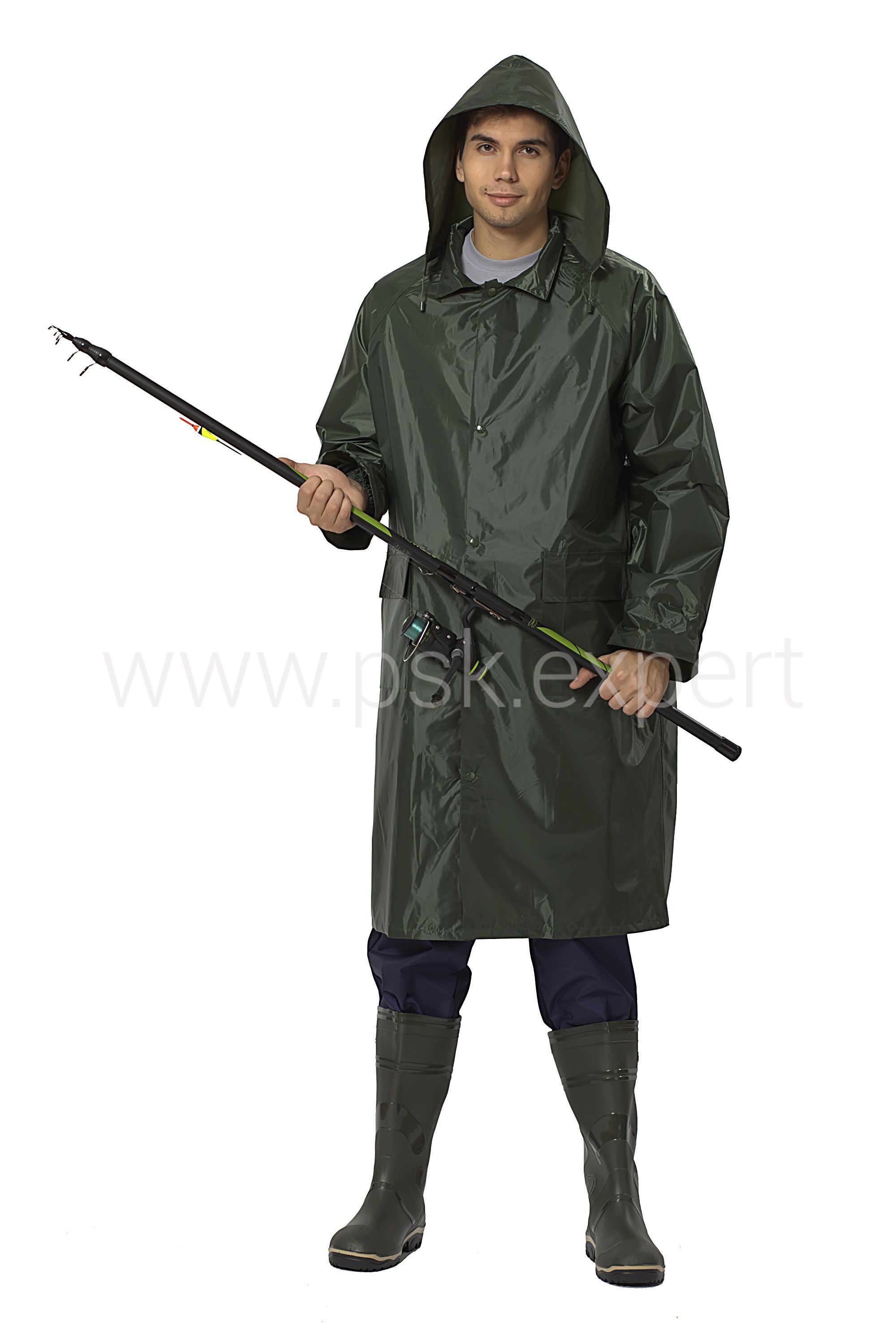 • Плащ с центральной застежкой на молнию и ветрозащитной планкой на кнопках, с капюшоном, с двумя накладными карманами с клапанами. В рукав плаща вшит внутренний ветрозащитный манжет с эластичной тесьмой. Для дополнительного комфорта в работе, в изделии имеются вентиляционные отверстия на спине и на уровне подмышечных впадин, что обеспечивает равномерный воздухообмен. Объем капюшона регулируется при помощи шнура. Плащ выполнено из 100% влагостойкого синтетического материала: нейлон с внутренним ПВХ покрытием. Все швы изделия проклеены изнутри и герметичны. Рекомендуется для рыболовецких и лесных хозяйств, муниципальных служб.