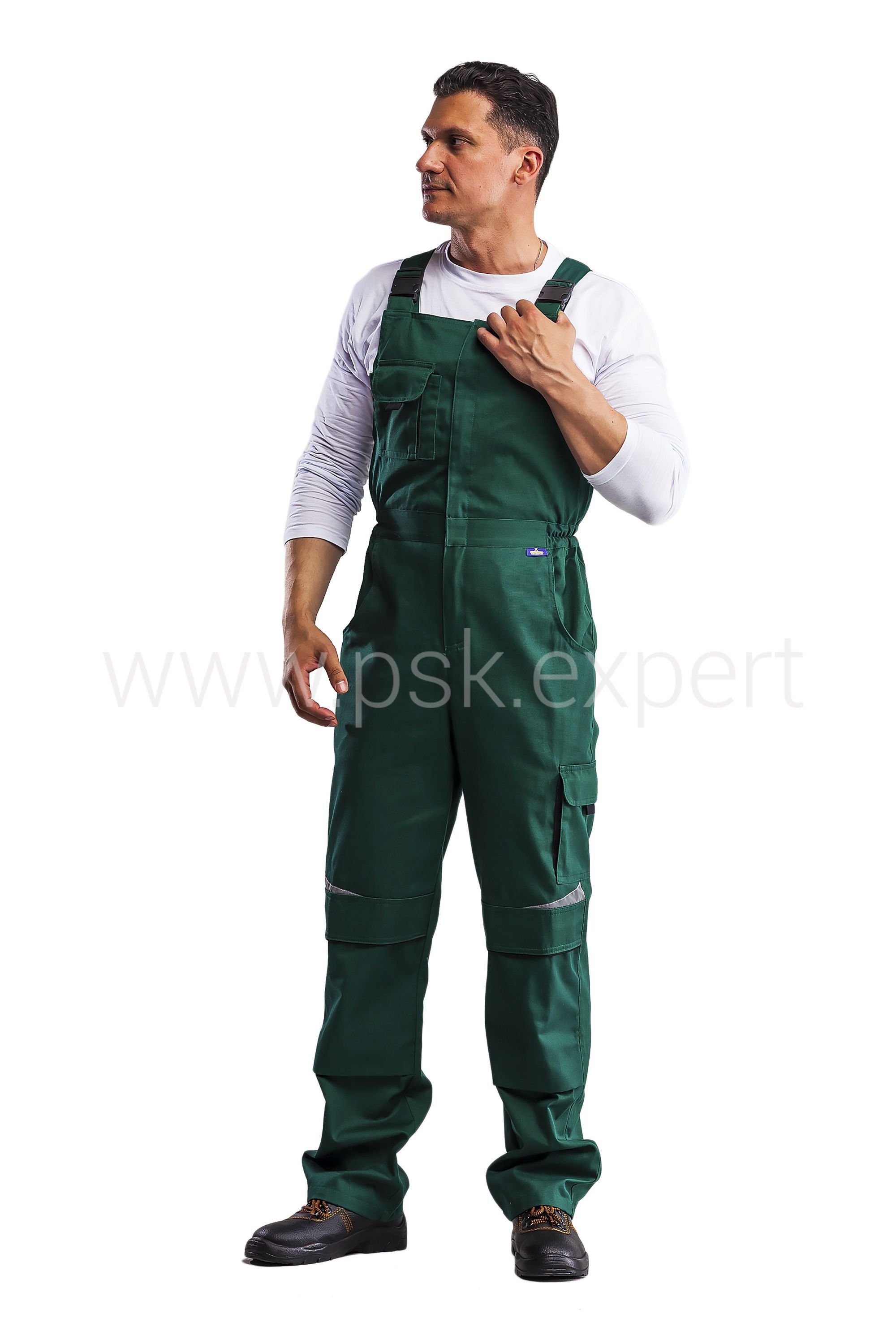 Полукомбинезон с высокой грудкой. Бретели с эластичной тесьмой и фастексами. Центральная потайная застежка на молнию позволяет быстро одеть комбинезон и исключает контакт фурнитуры с рабочим оборудованием. Пояс с эластичной тесьмой создает дополнительный комфорт. Нагрудный, задний и боковой карманы с клапанами застегивающимися на контактную ленту. Наколенники с верхними отверстиями для амортизационных вкладок закрыты клапанами. Фигурные светоотражающие элементы на спинке и в области колен.