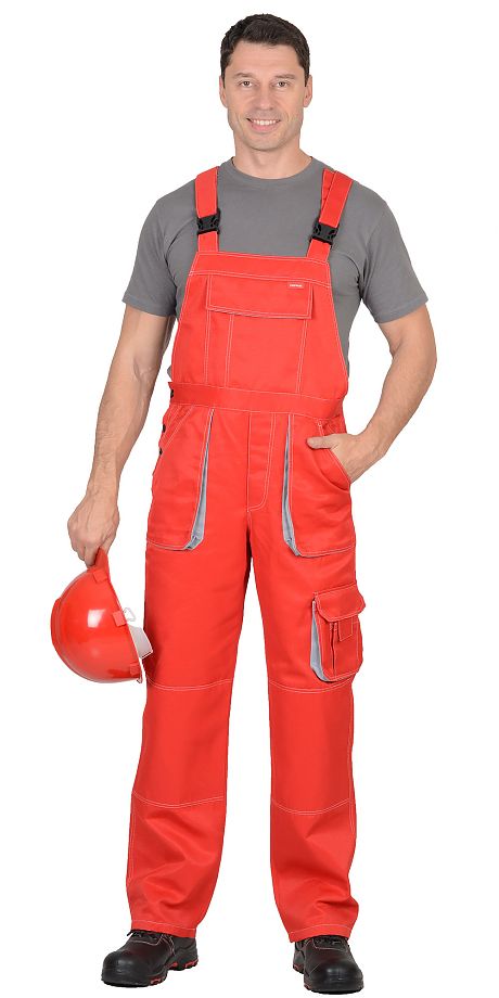 Полукомбинезон - прямой с контрастной отделкой, с бретелями, с застёжкой спереди и с застёжкой в правом боковом шве на три петли и три пуговицы. Полукомбинезон с различными многофункциональными карманами, спинка с частичной стяжкой по талии для лучшего прилегания по фигуре.