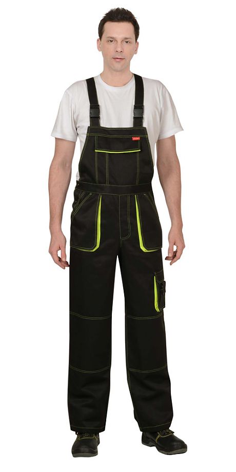 Полукомбинезон - прямой с контрастной отделкой, с бретелями, с застёжкой спереди и с застёжкой в правом боковом шве на три петли и три пуговицы. Полукомбинезон с различными многофункциональными карманами, спинка с частичной стяжкой по талии для лучшего прилегания по фигуре.