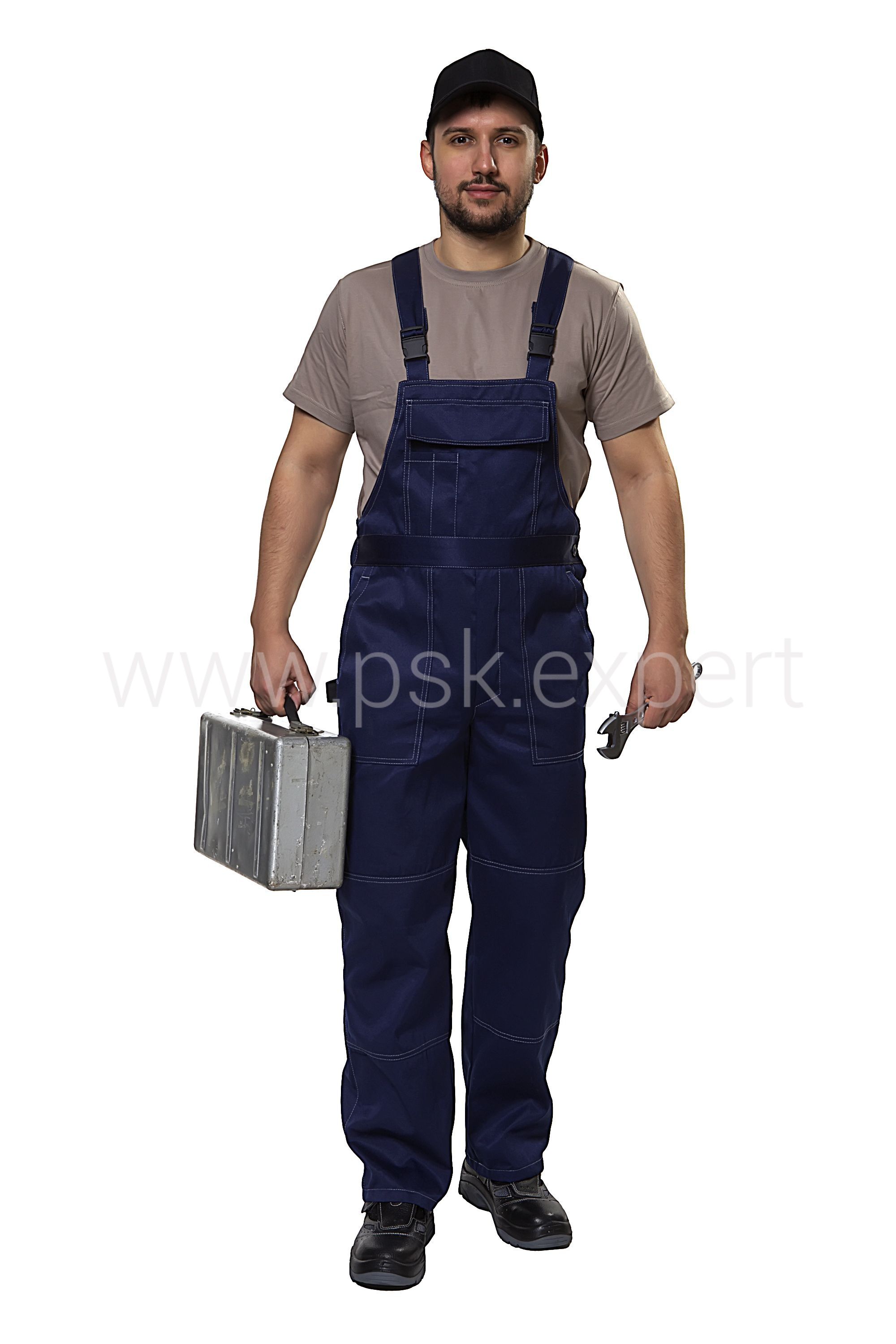 Полукомбинезон с притачной грудкой на бретелях с эластичной тесьмой, застегивающимися на фастекс, с застежкой на молнию, с боковыми карманами. Нагрудный карман с клапаном. На задней части брюк дополнительный карман для инструмента. Усиление в области колен. Все детали отстрочены контрастной отделочной строчкой.