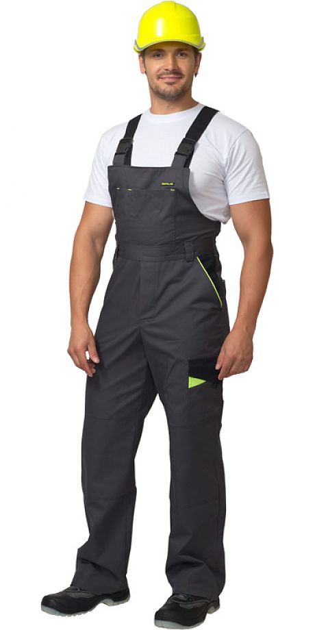 Полукомбинезон с застёжкой гульфика и застёжкой в правом боковом шве на пуговицы; с различными карманами; с наколенниками; по спинке вставлена резинка. ГОСТ 27575-87