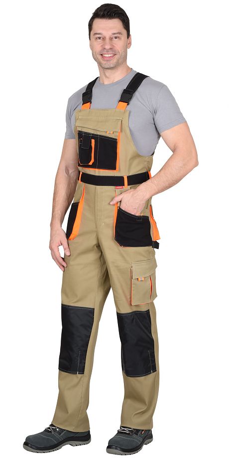 Полукомбинезон с застежкой гульфика на «молнию» и с застежкой в правом боковом шве на три петли и три пуговицы , с нагрудным накладным большим и малым карманом и карманом для телефона, с боковыми внутренними карманами, с накладным карманом на левом боковом шве с клапаном на липучке, с наколенниками, с двумя задними карманами с клапанами , и карманом для инструментов, по спинке вставлена резинка.