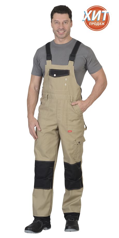 Полукомбинезон застежкой гульфика на тесьму - «молния», с застежкой в боковом шве на 3 джинсовые пуговицы, с фигурным карманом и клапаном на нагруднике застегивающийся на кнопку с логотипом «Сириус», с нижними накладными карманами с наклонным входом, с накладным фигурным карманом и клапаном застегивающийся на кнопку с логотипом «Сириус» на боковом шве, с задними накладными карманами с отлетным нижним краем и фигурными клапанами застегивающиеся на кнопку с логотипом «Сириус», с объемными наколенниками на передних половинках с возможностью вставить в них амортизационные вкладыши. С фигурной спинкой, по спинке вставлена резинка для лучшего прилегания.