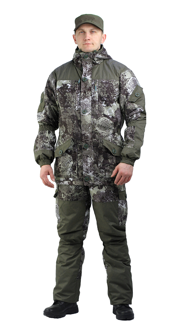 Камуфлированный универсальный костюм для охоты, рыбалки и активного отдыха при низких температурах. Не шуршит. Состоит из удлинненной куртки с капюшоном и полукомбинезона.