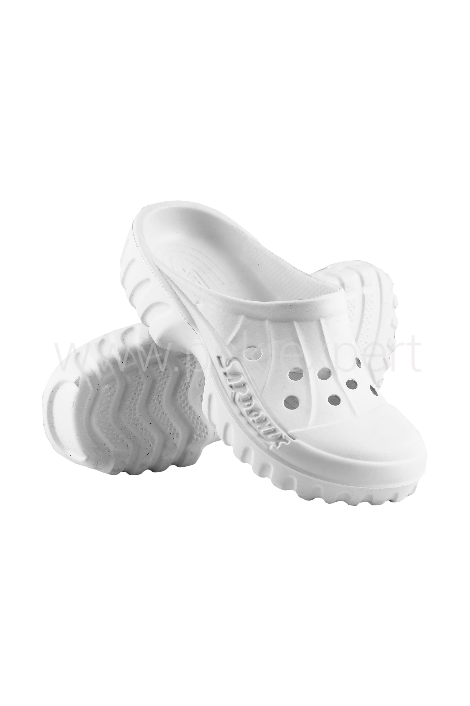 Сабо выполнены из облегченного полимера ЭВА, который обладает демпфирующими и антибактериальными свойствами, очень малым весом, устойчивостью к истиранию. Подошва имеет развитый рисунок, что позволяет уверенно чувствовать себя на скользких поверхностях. Модель универсальна, защищает от воды и грязи, удобная и широкая форма обеспечивает комфорт стопы на длительное время. Рекомендовано для работников пищевых предприятий и медработников и для универального применения.
