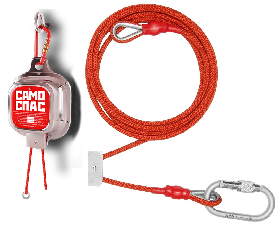 Карабин, предназначенный для соединения корпуса устройства с точками крепления на стене здания соответствует ГОСТ Р 12.4.225-99, разрывная нагрузка 2200 кг.