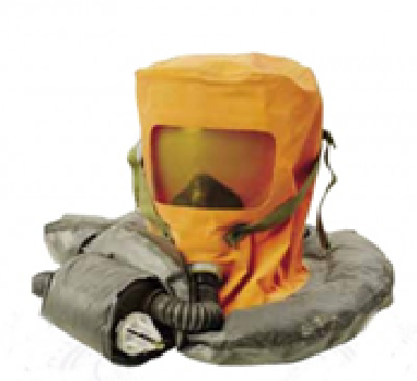Капюшон самоспасателя выполнен из трудногорючего герметичного материала с теплоотражающим покрытием, устойчивого к кратковременному воздействию открытого пламени и высокой температуры. Материал капюшона выдерживает воздействие поверхностно-активных веществ.