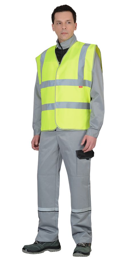 Тк. "Габарит", 100 % - п/э. Размер универсальный. Боковые хлястики и полукольца, центральная застёжка на "липучку", края окантованы. 4 ряда СОП 50 мм: 2 вертикальные и 2 горизонтальные. ГОСТ 12.4.219-99.
