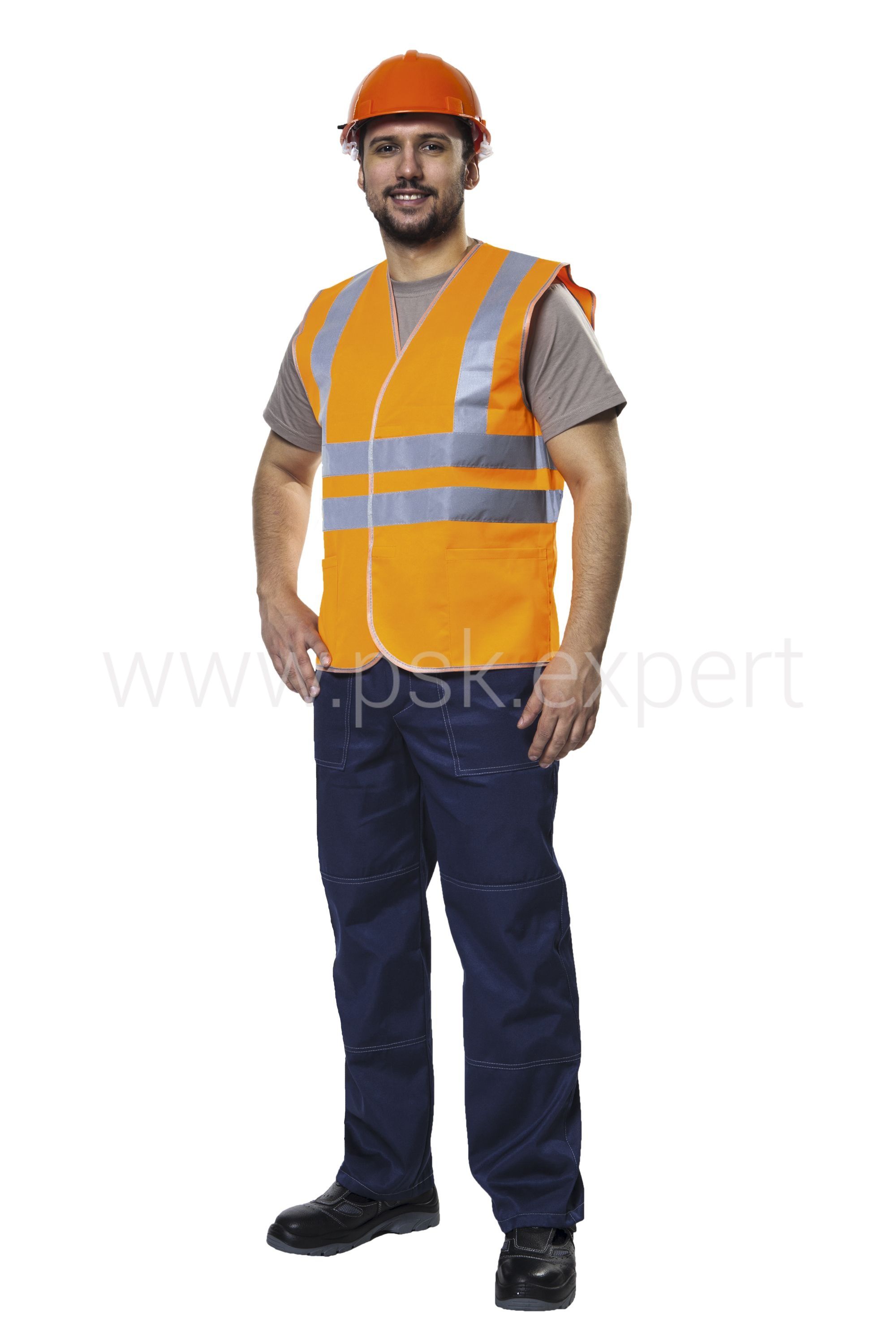 Жилет сделан из прочного трикотажного полиэфирного полотна с четырьмя светоотражающими полосами для повышенной видимости шириной 50мм. СОП проложены горизонтально вокруг торса и вертикально от плеча до уровня горизонтальных СОП. Жилет окантован полиэстровой тканью, имеет центральную застежку на контактную ленту липучку, два накладных кармана 15см*15см на передних полочках. Рекомендуется для дорожных рабочих, строителей, муниципальных служащих, водителей. Соответствует 2-му классу защиты.