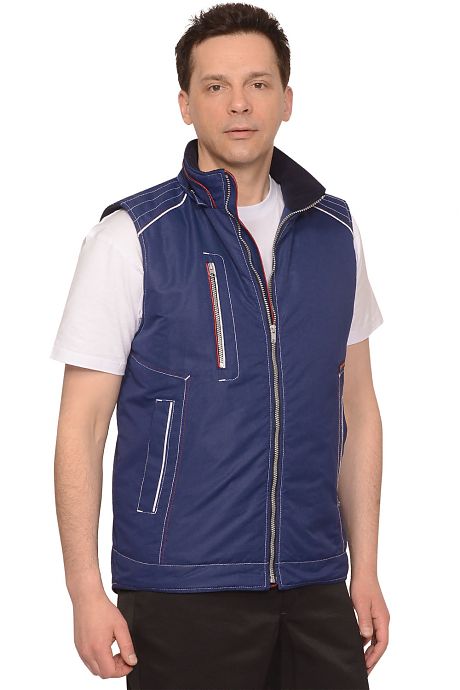 Жилет прямого силуэта утепленный, воротник - стойка с отделочной деталью и кантом; полочка с двумя нижними прорезными карманами "листочка" и одним прорезным карманом "в рамку" на молнии (на правой полочке); на деталях жилета выполнены декоративные отделочные строчки серого и бордового цвета; с внутренней стороны на левой полочки расположен внутренний накладной карман на молнии; спинка удлинена.